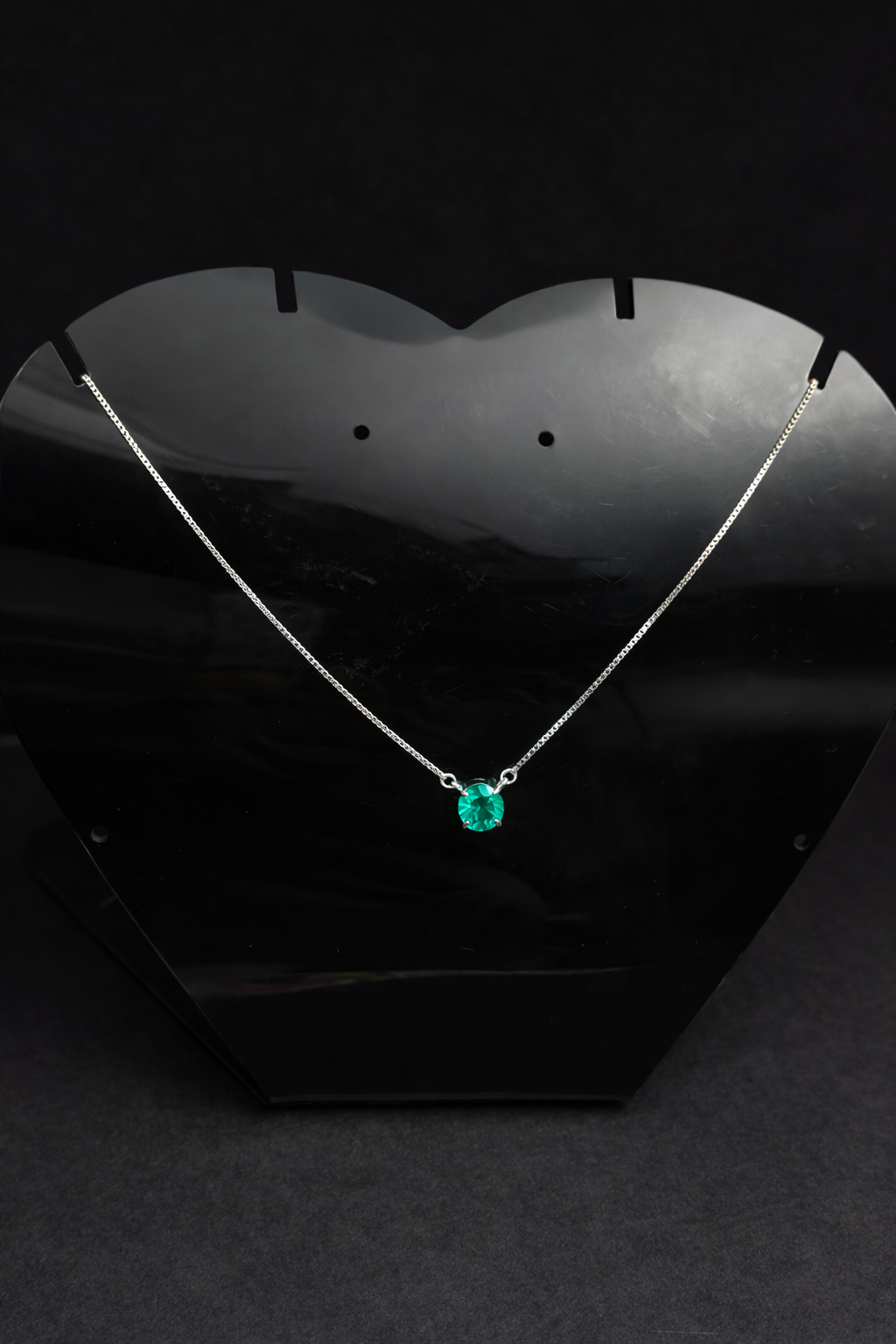 - Design: Circular pendant with a serene sea green stone on a plain chain
